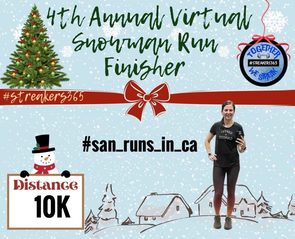 As if the monthly trackers are not enough, our Streaker365 admin team also comes up with other seasonal fun challenges, and in December, they host a Virtual Snowman Run. I pledged 10K this year and completed my run this weekend! I am squishing all my training runs at the end of the week right now (which is not ideal,) but I’ve been struggling with the late sunrises and early sunsets. I’ve been doing my early morning workouts at home and have taken my runs to the treadmill this week. I am so thankful that I have access to one.