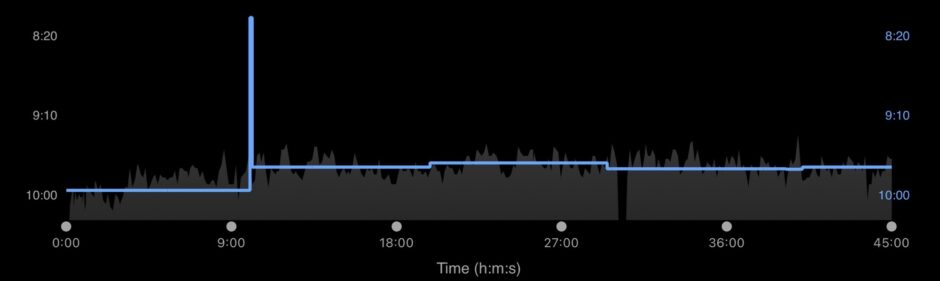 I hopped on the treadmill for a 45-minute endurance run this morning. Not sure what my Garmin was up to, that weird spike at the beginning wasn’t me.
