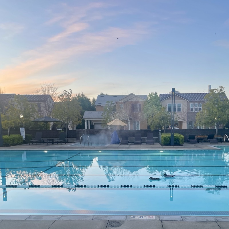 Two little duckies swimming morning laps in our community pool. (Also: that morning light!)